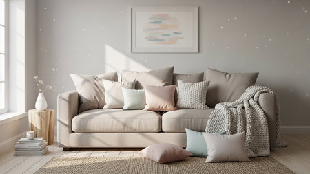 A bright and cozy living room featuring modern furniture and soft pastel colors. The space includes comfortable seating, decorative pillows, and artistic wall decor, creating a relaxing and inviting atmosphere, enhanced by indoor plants and stylish light fixtures.