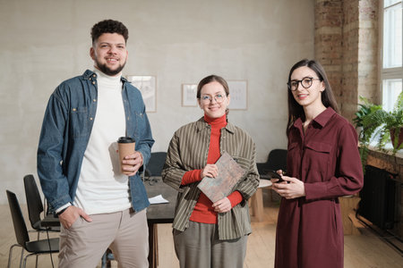 Diverse group of business people standing by glass wall while discussing project in modern office, copy space