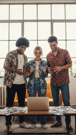 A full-length vertical shot of three fashionable friends in their early twenties planning a large de