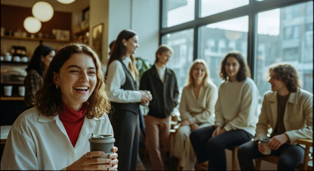 A group of young adults socializing in a cozy cafe, with one woman in the foreground smiling and holding a coffee cup, natural light coming through large windows