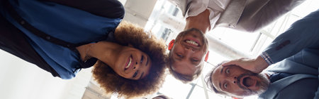 Below view of several happy business partners looking at camera while embracing each other