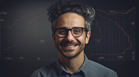 Man standing in front of the stock finance chalkboard, courteous and professional.