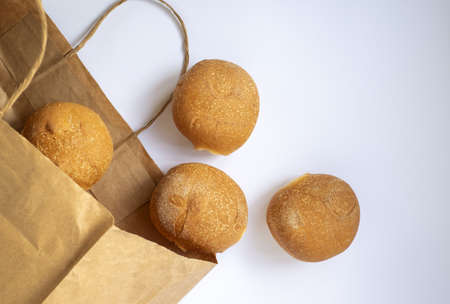 fresh baked buns dropped from a bag of rough brown paper