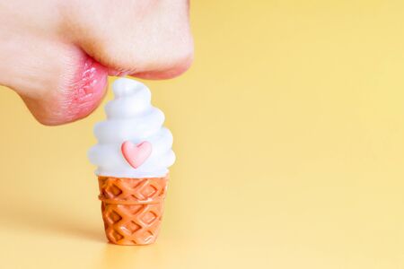 Closeup of female lips over a toy ice cream on yellow background
