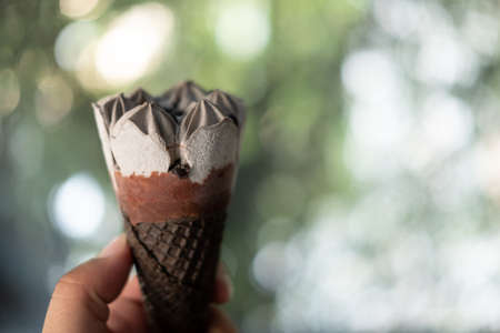 Man hand holding ice cream chocolate wafer cone against on a blur nature background. Sweet menu concept.