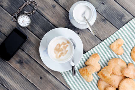 Foods of the Italian breakfast with coffee milk and biscuits on an old wooden table, photographed from above