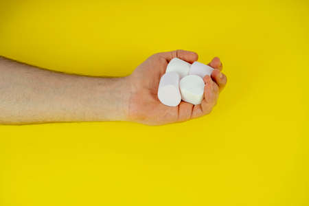 White marshmallows in a male hand on a yellow background.
