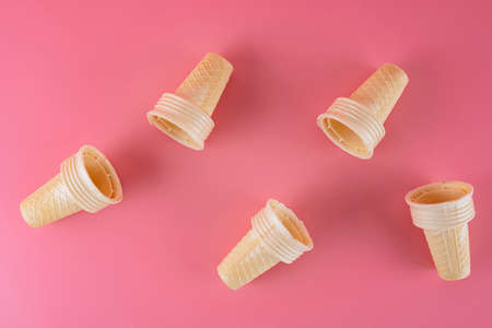 Empty ice cream cone on pink faded pastel color background, wafer cup concept