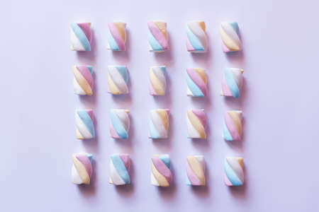 Flat lay with colorful marshmallows on white surface