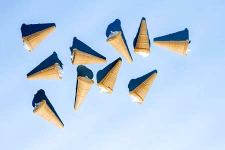 Ice cream cones on blue table. Summer background