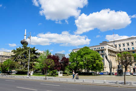 Bucharest, Romania, 6 May 2021: Monuments near the Central University Library in Revolutiei Square (Piata Revolutiei) in Victoriei Avenue (Calea Victoriei)