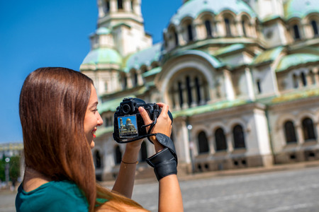 Woman tourist photographing with professional photo camera the St. Alexander Nevsky Cathedral in Sofia, the capital of Bulgaria