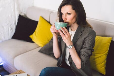 Woman using laptop on sofa at home in the living room and holding a cup of coffee