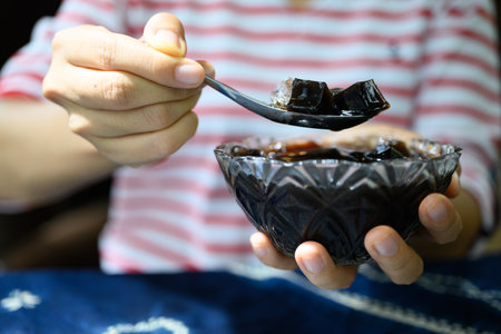 Grass jelly or herb jelly, Dessert in Southeast Asia made from plant eating with syrup and ice