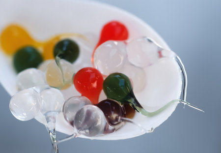A white spoon holds colorful, translucent boba pearls, arranged in a tempting cluster that highlights their gelatinous textures. Tapioca pearl