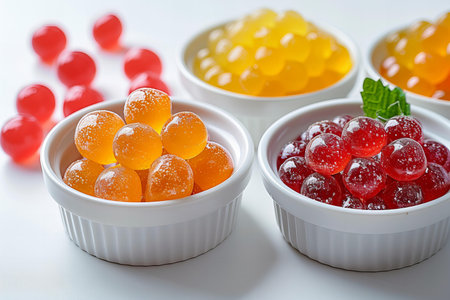 colorful jelly candies in bowls on a white background.