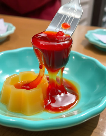 close up of colorful jelly on plate on table,