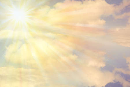 Sun-ray with fluffy white clouds flying on sunrise sky background