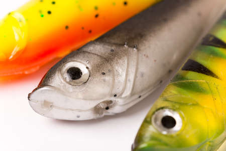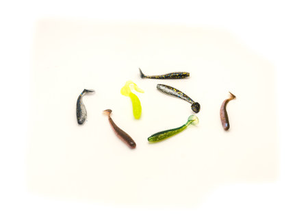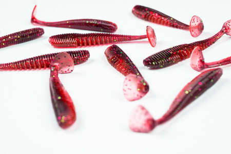 Colorful silicone plastic fishing baits isolated on white background. Selective focus.
