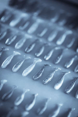 Fishing lures. Vibrohvost and twisters closeup on blue background