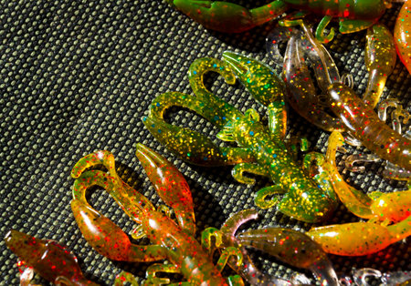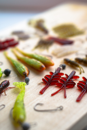 Colorful silicone fishing baits with plummets on wooden table. Various fish and worms and crayfish. Toned image and top view. Stock background, photo