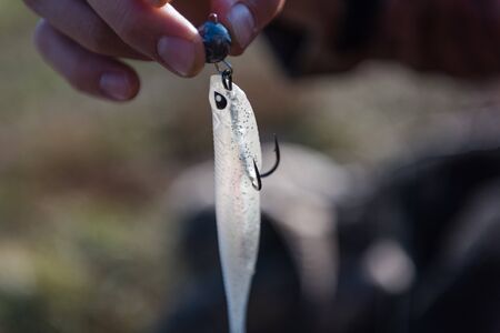 Fisherman puts on silicone bait. Jig fishing. Silicone gear. Tackle for fishing. Pike perch fishing