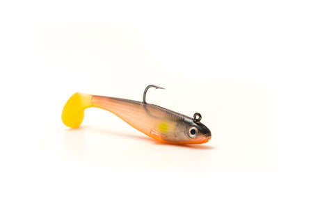 Single Jig Head Shad Soft Fishing Lure with hook and Paddle Tail Swimbaits isolated on white background. Plastic artificial bait for striped bass, freshwater fishing