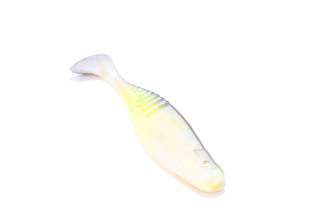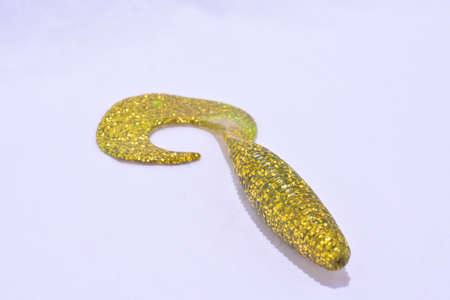 Colorful wide selection of Plastic Worms Baits Paddle Tail Swim baits with Chartreuse Glitter and ribbed design isolated on white background. Shad fishing lure swim bait with clipping path and copy space