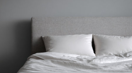 A serene gray bed setup featuring soft pillows and wrinkled bedding. This minimalist scene creates a relaxed atmosphere perfect for restful sleep and comfort.