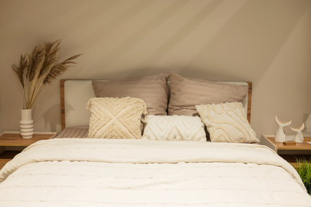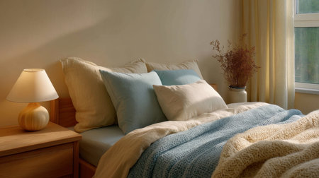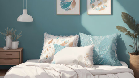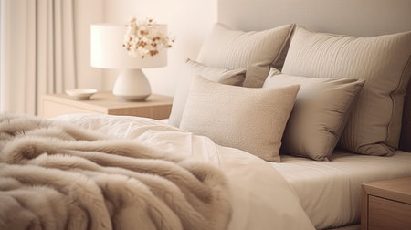 Cozy bedroom setup with pillows and an upholstered headboard. Fall minimalist simple composition. AI generated illustration