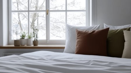A cozy bedroom scene featuring elegant pillows and soft textiles by a window, creating a warm and inviting atmosphere for relaxation and comfort.