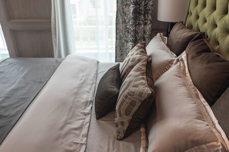 classic bedroom style with set of pillows on bed, interior design decoration concept