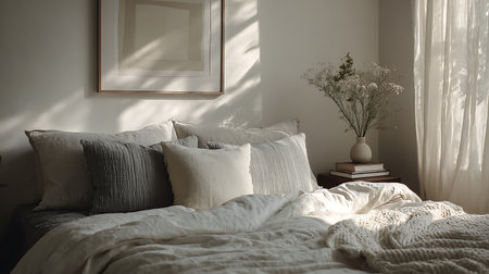 A cozy bedroom scene featuring soft textiles, plush cushions, and a serene atmosphere. Perfect for conveying comfort, relaxation, and modern interior design.