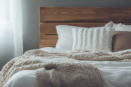 Cozy minimalist bedroom with wooden headboard and soft textures. That the image is generated using AI.