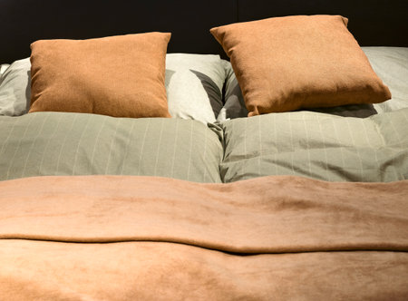 Soft bedding with striped pillows and crumpled sheets