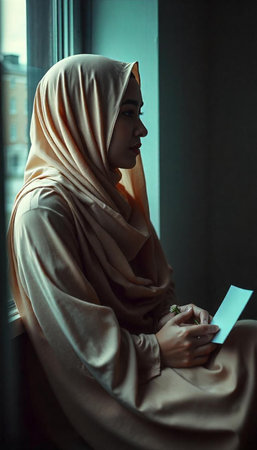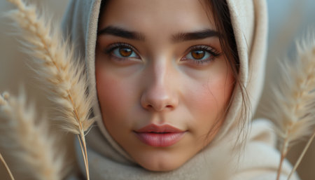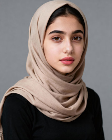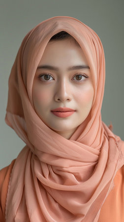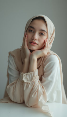 Female with dark hair, wearing a light hijab, gazes at the viewer with expressive eyes, creating a calm atmosphere against a soft, neutral backdrop