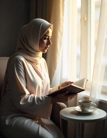 Young muslim woman reading a book at home in the morning.