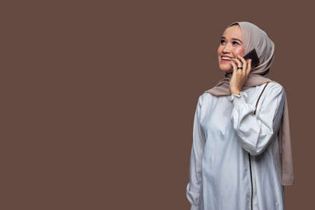 Beautiful woman wearing hijab is making a phone call with a smiling expression while looking up isolated on plain background