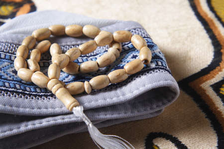 Close up tasbih, moslem prayer beads rosery on a quran.