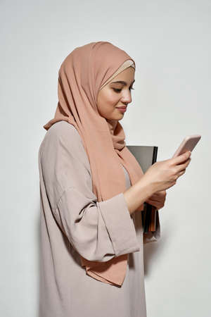 Happy arabian girl student in hijab using smartphone
