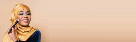 happy muslim woman in yellow hijab applying makeup foundation with cosmetic brush isolated on beige, banner