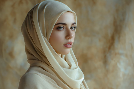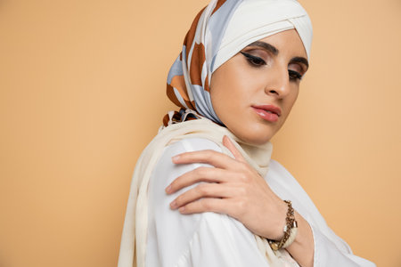 beautiful muslim woman with makeup posing in silk elegant headscarf and white blouse on beige