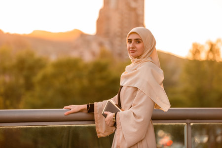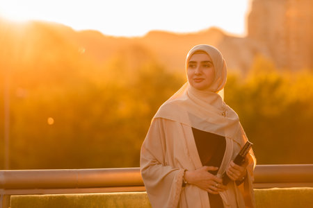 A happy confident Muslim business woman in hijab outside, with sunset flare.