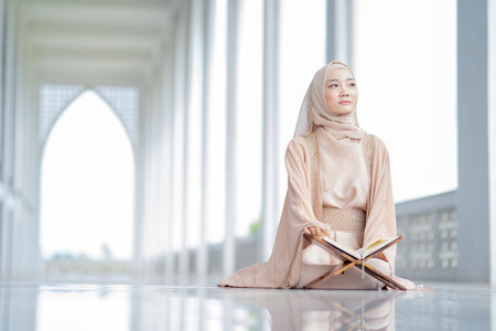 The image of an Asian Muslim woman in the Islamic religion in hijab in cream color. reading the Quran and having a happy smiling face Staying in a beautiful mosque