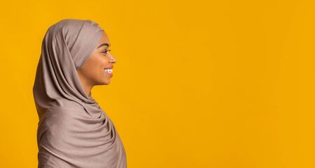 Profile portrait of smiling black muslim woman in headscarf looking at copy space over yellow background, panorama