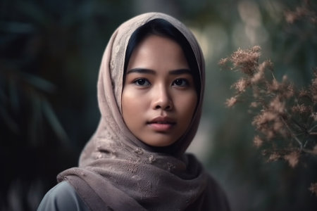 Portrait of a beautiful, elegant and attractive young Malay Asian Muslim woman in a dress and an hijab head scarf.