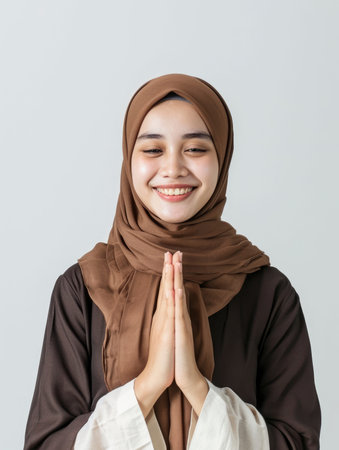 muslim woman looking at camera showing hand together gesture