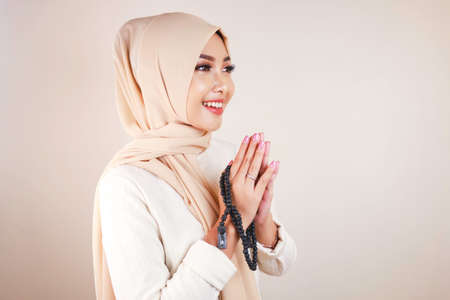 Potrait of cheerful young beautiful Asian Muslim woman smiling and holding prayer beads. Eid Mubarak concept