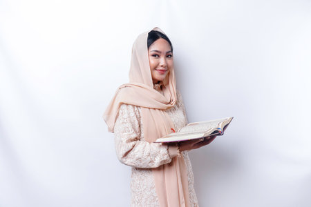 Young Asian Muslim woman smiling and holding the Quran