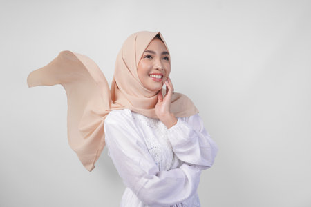 Elegant young Asian Muslim woman wearing white dress with hijab waving in the wind, modelling pose on white background